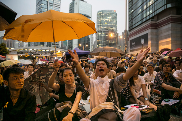 10月22日凌晨,在金钟占领区的示威市民,呼吁香港拥有民主。(Paula Bronstein/Getty Images)