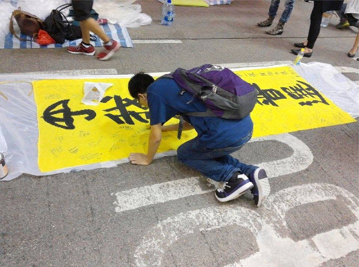 今天(24日)中午港府将悬挂在狮子山的巨型标语〝我要真普选〞拆走,但是却清不走港人的诉求。今天晚上民众在铜锣湾占领区手写4米高的条幅〝我要真普选〞,并上书〝你拆一幅我挂十幅〞,条幅用数个大型黄色氢气球连接升起。