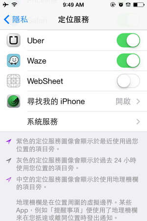一般iPhone手机于安装应用程序时,系统不会先询问用户是否授权所在地理位置等信息,除非涉及敏感资讯时,才会要求用户授权。如果要设定有哪些应用程序可以读取定位服务,操作步骤是:到【设定】>【隐私】>然后选择可读取你所在位置的应用程序,如:定位服务、Google Map或是照片等,最后开启定位服务。如果不想要手机的定位服务功能,只要在屏幕最上方滑一下开关,即可关闭定位服务,但这时地图功能也会不灵了。