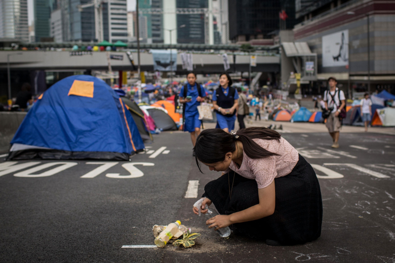 10月22日,金钟占领区,一名女士在为路中的植物浇水。(Chris McGrath/Getty Images)