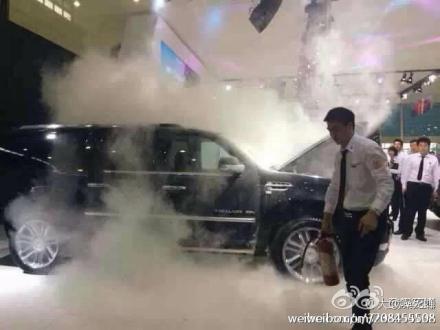 据大陆 媒体报导,车展开幕的第2天,10月17日早上,在B6馆2号凯迪拉克展台突然烟雾弥漫,开始人们以为是商家商演秀环节中的特效效果,但走近一看原来是展台上的展车突然起火了。