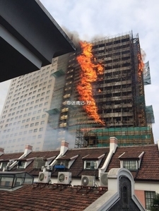 从当地网民上传的现场图片可见,大楼外层脚手架上火势很大,现场浓烟滚滚,在远处均能看到。