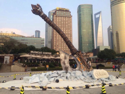 据大陆 媒体报导,日前,知名游戏品牌中的巨大战斧“血吼”模型惊现中国 大陆上海,引市民围观、网友议论联想。有评论说,上海魔都之称从此名副其实了。