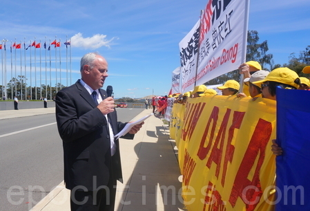 【大纪元2014年11月18日讯】(大纪元记者叶紫云堪培拉报导) 11月17日,来自悉尼、墨尔本、布里斯本、帕斯及堪培拉当地的部份法轮功学员、近500人在堪培拉国会大厦前举行集会,向在澳洲国会大厦演讲的中共国家 主席习近平呼吁立刻制止强行活摘法轮功学员器官的罪行并将所有参与迫害的责任人绳之以法。澳联邦议员也加入法轮功之列,要求中共当局立刻停止在中国发生的 对法轮功学员的活摘器官。