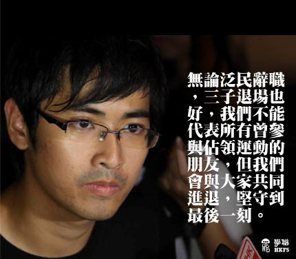 对于退场一事,学联表示:〝无论泛民辞职,还是三子退场,我们不能代表所有曾参与 占领运动的朋友,但是我们会与大家共同进退,坚守到最后一刻。〞