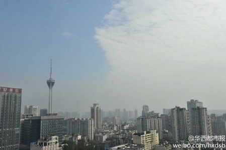 据陆媒报导,四川省成都市近日阴霾笼罩,11月14日下了一场大雨。但是,天空中的霾却并未完全消散。15日上午,成都市上空出现半边是蓝天,半边是阴霾的天象。