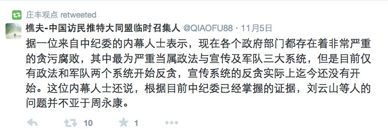 近日,时评家庄丰在海外 推特转推称:据一位来自中纪委的内幕 人士表示,现在各个政府部门都存在着非常严重的贪污腐败,其中最为严重当属政法与宣传及军队三大系统 ,但是目前仅有政法和军队两个系统开始反贪,宣传系统的反贪实际上迄今还没有开始。这位内幕人士还说,根据目前中纪委已经掌握的证据,刘云山等人的问题 并不亚于周永康 。