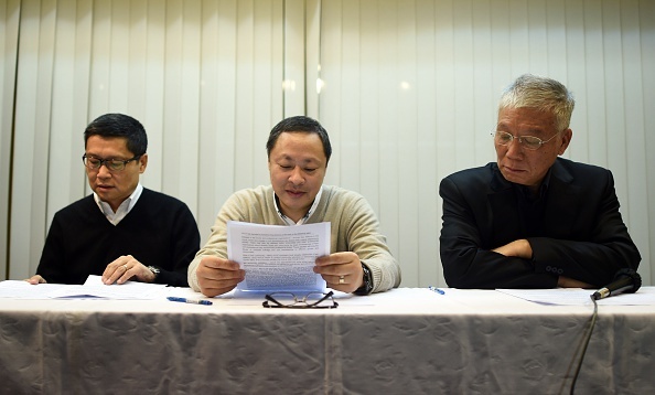 占中三子陈健民(左)、戴耀廷(中)、朱耀明。(JOHANNES EISELE/AFP/Getty Images)