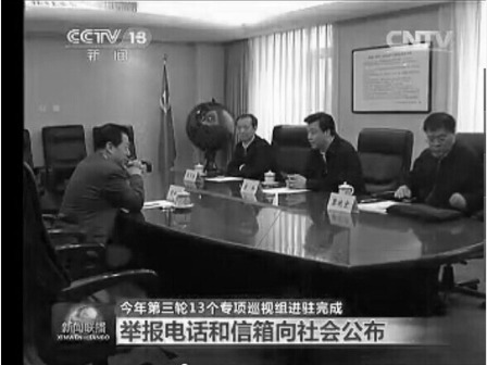 11月30日晚,喉舌央视的新闻播出了环保部部长周生贤被巡视组约谈的报导。画面显示,在一间小会议室里,环保部部长周生贤坐在办公桌的一方,坐在他对面的分别是:中央巡视工作领导小组成员、办公室主任黎晓宏和中央第三巡视组组长吉林、副组长韩亨林。现场巡视组的负责人一边问话一边笔录,另一人则用电脑记录谈话内容