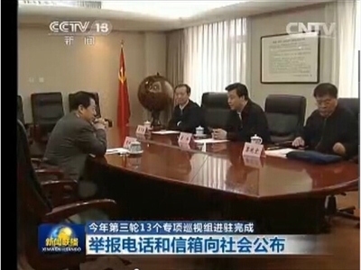 中共央视新闻11月30日晚播出中纪委第三巡视组约谈中共环保部部长周生贤的画面:在一间小会议室里,周生贤坐在办公桌的一边,另一边坐着中央巡视组办公室主任黎晓宏和中央第三巡视组组长吉林、副组长韩亨林。据报导,巡视组在环境部的巡视将持续一个月至12月26日。