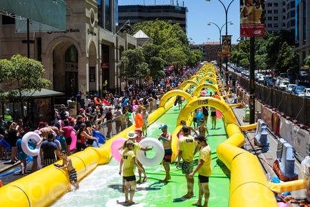 位于珀斯市商务区的圣乔治街在周日变成了一个大游乐场,街道上充满了身着泳衣、短裤,手持大号救生圈的大人和孩子们。315米长的巨型水滑梯从圣乔治街Elder街一端开始,中段还设有小巷提供小吃摊。周日阳光明媚,温度也是适宜的27摄氏度。