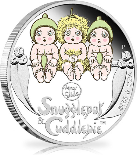 为纪念澳洲著名儿童作家梅?吉卜斯(May Gibbs),珀斯铸币厂将她所创造、广受澳洲人欢迎的人物小胖壶(Snugglepot)和小面饼 (Cuddlepie)铸在了银币上。