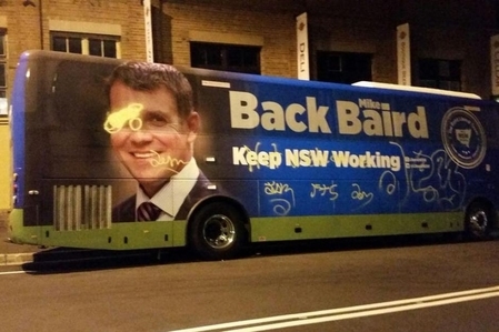 近日,纽省省长贝尔德(Mike Baird)在蓝山(Blue Mountains)拉选票,他的竞选巴士车在一夜之间遭人恶搞涂鸦,但他对这一令人不快的事件处之淡然,一笑了之。