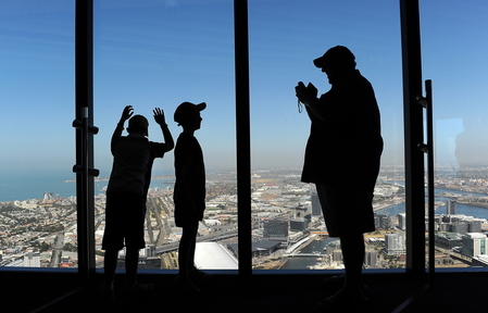 游客在南半球最高的尤里卡88观景塔上留影。(TORSTEN BLACKWOOD/AFP/Getty Images)
