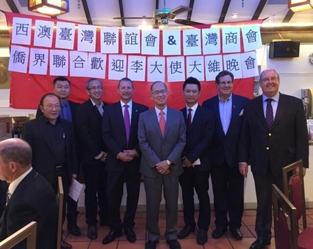 4月18日西澳侨胞举办盛大联合晚宴欢迎李大维。右四李代表大维、右一西澳洲议员John McGrath、右三西澳州台湾联谊会会长范智明、左四西澳州议员Matthew Taylor、左二西澳州台湾商会会长廖志华、左一侨务促进委员查孝翰。(大纪元图库)