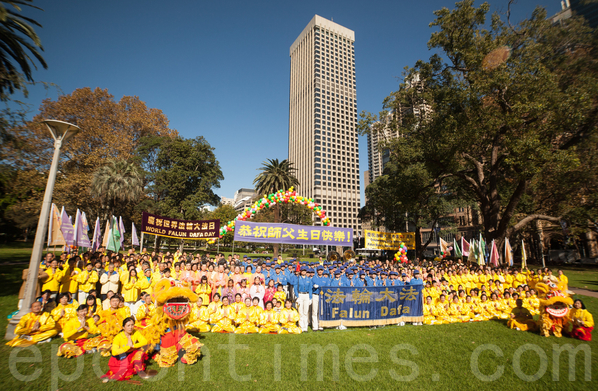 2015年5月9日(周六),来自澳洲各地的500多名法轮功修炼人聚集在悉尼市中心,以晨练,集会和盛大游行的全天活动,庆祝法轮大法创始人李洪志大师生日和法轮大法洪传23周年。纽省绿党议员,帕拉玛塔市议员及人权活动家都来参加了庆祝集会并祝贺法轮大法。