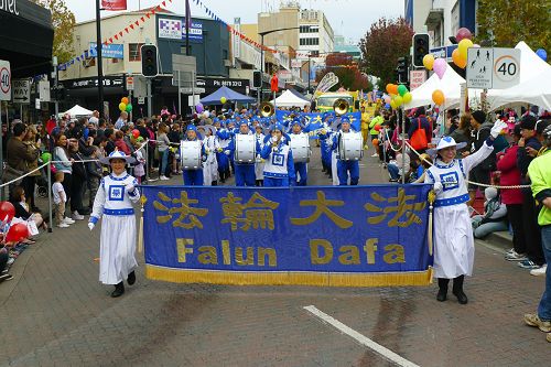 法轮功团体的游行队伍受到黑镇民众欢迎