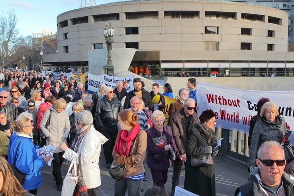 过往的澳洲市民纷纷停下脚步倾听法轮功学员的介绍,了解法轮大法的美好以及中共迫害法轮功的残暴。了解真相后的民众主动签名制止中共活摘法轮功学员器官。过往车辆亦鸣笛支持,有的摇下车窗,挥舞手臂,索要真相资料。
