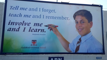 吉尔福德文法学校这则广告牌上的“名言”并非出自于富兰克林。(Dodgy Perth网站)