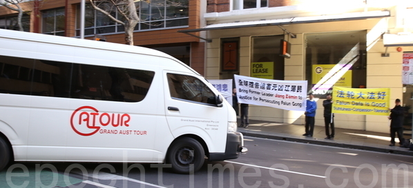 早上9点多,湖北省政府一行人乘坐的两辆白色小型巴士在乔治街后面的肯特街(Kent St)进入悉尼市府的停车场时,看到了由路边法轮功学员打出的“法轮大法好”,“法办迫害法轮功凶手李鸿忠”和“全球控告迫害元凶江泽民”的横幅。当这一行人在上午近11点坐车离开该停车场时,再次遇到等在街上的法轮功学员,再次看到了他们展示的这些横幅。