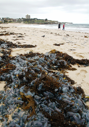 随着悉尼海水的转暖,大量蓝瓶僧帽水母(Bluebottles,学名Physalia utriculus)被冲到悉尼的沙滩上。专家们警告游泳者要小心,谨防这种蓝色透明的海洋生物叮人。