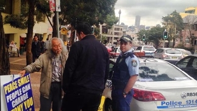 前议员、和平活动家丹尼?林因在街头举着对总理艾伯特有侵犯性言论的牌子而被罚款500元。(网络图片)