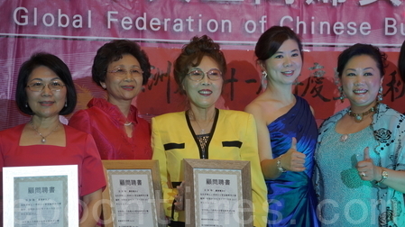 世华会颁发顾问证书以示感谢。从右至左: 创会会长林淑敏、现任会长陈瓴薽、顾问高尚之画家、顾问陈秋燕、顾问黄素珍委员。(林达/ 大纪元)