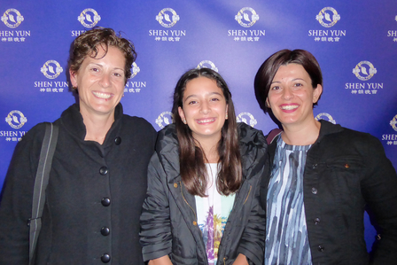 2月22日晚,Phebby Christy(右)及女儿(中)和姐姐Jo Stabrou(左)在墨尔本一起观看了神韵演出。(纪芸/大纪元)