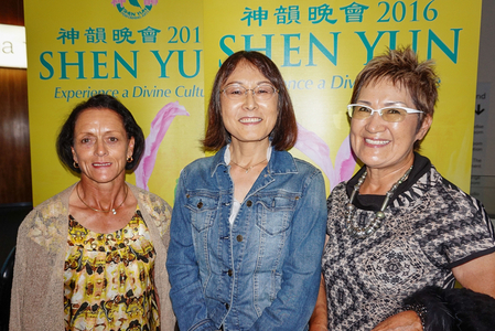 3月5日下午,日本金融策划师Michiko Takahashi(中)、友人Shizuko Takai(右)及Shirley Dean一同观看了神韵在黄金海岸艺术中心的第二场演出。(李明/大纪元)