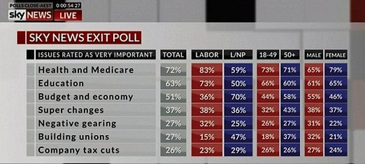 72的%选民都将医疗卫生和医保Medicare视为最关心议题,63%则最重视教育。这些问题的相关政策都是工党竞选宣传的基础。投给自由党的选民则更为重视预算和经济。负扣税和建筑工会是最为投票者们忽视的问题,只有27%的选民认为他们很重要。Galaxy Research的选举后民调显示,双方势均力敌,很难做出准确预测。