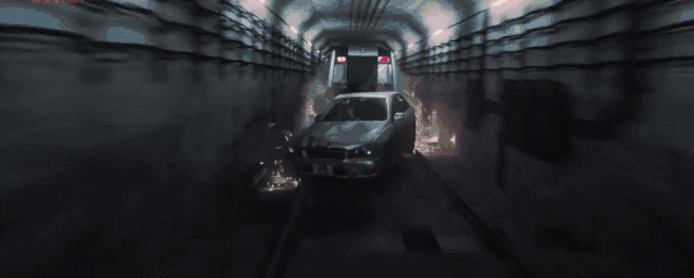 最震撼的还属冲进地铁的那一幕,随着清脆的玻璃闸门炸裂声,两车冲进铁轨被后来的地铁追尾撞上,轮胎与轨道摩擦出火花,滋裂声萦绕整个影院,双雄对决更是迎来了高潮!