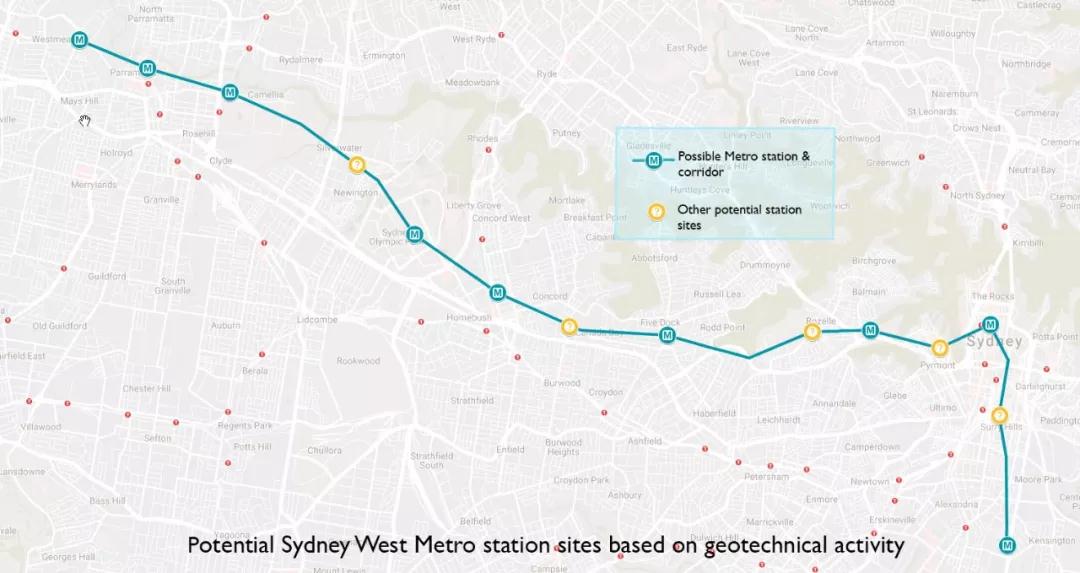 沿线可能增设的地铁站包括:Westmead、Parramatta、Camellia、Sydney Olympic Park、North Strathfield、Five Dock、The Bays Precinct、Sydney CBD和Zetland。