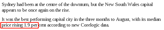 但是在全澳范围内,8月房屋中位价总得来说上升了0.8%。 房地产已经度过了寒冬,开始抄底反弹Corelogic网站的调查主任Tim Lawless表示:8月不光房价在涨,房屋清盘也有了大幅上升,房屋闲置率也有了很大规模下降。“现在看来,联邦政府的一系列政策,的确振兴了市场信心。最近以来低利率、减免税以及宽松的信贷政策,都起到了良好效果。”